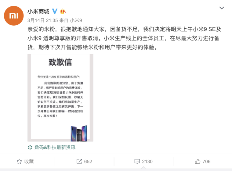 官方微博原文:很抱歉地通知大家,因备货不足,我们决定将明天上午小米9 SE及小米9 透明尊享版的开售取消。小米生产线上的全体员工,在尽最大努力进行备货,期待下次开售能够给米粉和用户带来更好的体验。