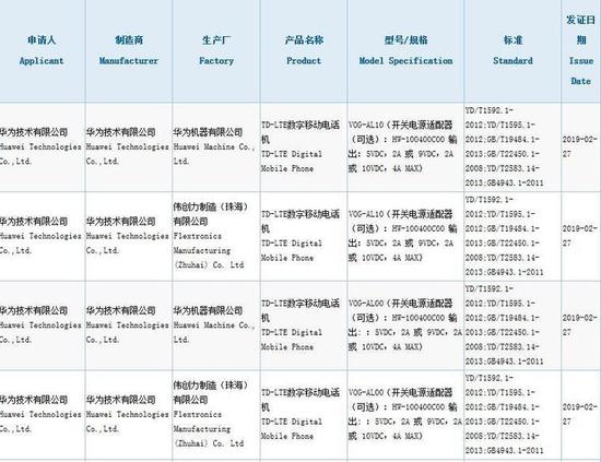 另据国家3C认证中心官网透露的消息显示,华为P30、华为P30 Pro将由华为机器有限公司、鸿富锦精密工业(深圳)有限公司、伟创力制造(珠海)有限公司三家企业联合生产,前者标配型号为HW-050450C00的充电头,最大支持22.5W的快充;后者选配HW-100400C00的充电头,最大支持40W的快充。