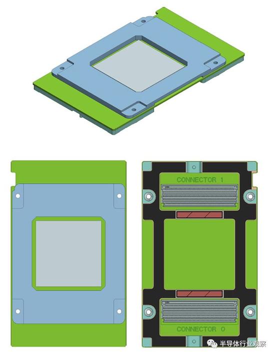 通过OAM,加速器被插入一个便携式插座,它的管脚在一侧,然后是一组标准的并行管脚,它在概念上类似于英伟达的SXM2插座,用于Pascal和Volta GPU上的NVLink,从模块上取下并插入主板上匹配的端口中。下图说明了它的原理: