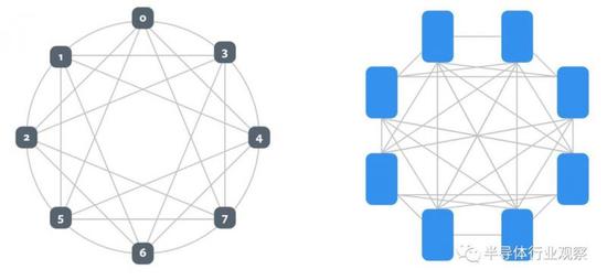 左图中,每个加速器有6个端口,8个加速器连接在一个混合立方体网格中。右图中,仍然有8个设备,但是每个设备都有一个额外的端口(总共7个),这些设备可以按照all-to-all的互连方式进行链接。显然还有其他选择,重点是不同的神经网络在不同的互连拓扑结构中效果更好,这将允许Facebook和其他公司改变互连的拓扑结构,以满足神经网络的需求。
