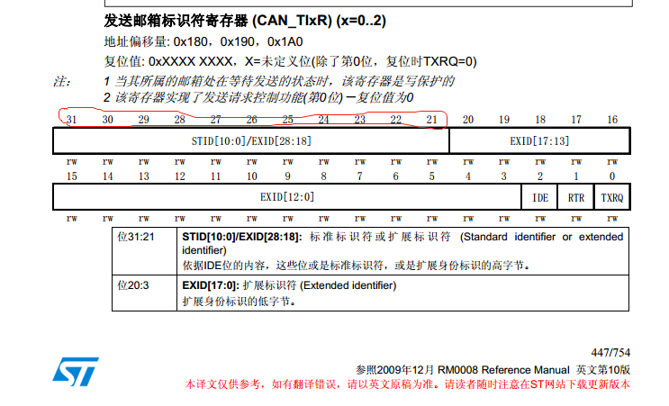 for(i=0;i TxMessage.Data[i]=msg[i]; mbox= CAN_Transmit(CAN1, &TxMessage); i=0; while((CAN_TransmitStatus(CAN1, mbox)==CAN_TxStatus_Failed)&&(i<0XFFF))i++; //等待发送结束 if(i>=0XFFF)return 1; return 0; } 代码中使用回环测试标识符滤波功能。标准标识符0X123。这里要注意虽然赋值为0X123但是在CAN_Transmit(CAN1, &TxMessage)函数内部会有这样一句话,会发现把StdId右移了21位。 CANx->sTxMailBox[transmit_mailbox].TIR |= ((TxMessage->StdId << 21) | TxMessage->RTR);//标准帧只有31-21位 由上图的寄存器位结构,实际上移位以后可以看做0X123<<21=0X24600000; 再看标识符滤波器的设置代码 CAN_FilterInitStructure.CAN_FilterNumber=0; //过滤器0 CAN_FilterInitStructure.CAN_FilterMode=CAN_FilterMode_IdMask; //屏蔽位模式 CAN_FilterInitStructure.CAN_FilterScale=CAN_FilterScale_32bit; //32位宽 CAN_FilterInitStructure.CAN_FilterIdHigh=0x2460; //32位ID CAN_FilterInitStructure.CAN_FilterIdLow=0x0000; CAN_FilterInitStructure.CAN_FilterMaskIdHigh=0xFFE0;//32位MASK 设置为31-21位全部匹配 CAN_FilterInitStructure.CAN_FilterMaskIdLow=0x0000; CAN_FilterInitStructure.CAN_FilterFIFOAssignment=CAN_Filter_FIFO0;//过滤器0关联到FIFO0 CAN_FilterInitStructure.CAN_FilterActivation=ENABLE;//激活过滤器0 标准帧只有31-21位,所以滤波器设置参数时只需要设置31-21位。 由123<<21位得到0x24600000,所以CAN_FilterInitStructure.CAN_FilterIdHigh=0x2460。 屏蔽位设置为31-21位全部匹配CAN_FilterInitStructure.CAN_FilterMaskIdHigh=0xFFE0;这样只能接收0x123发送的数据。