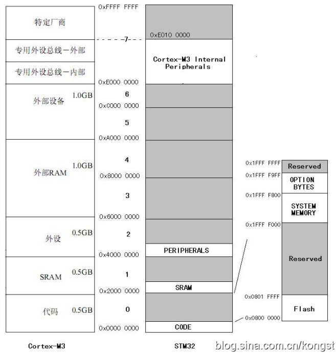 首先,我们对比一下Cortex-M3存储器结构和STM32存储器结构: