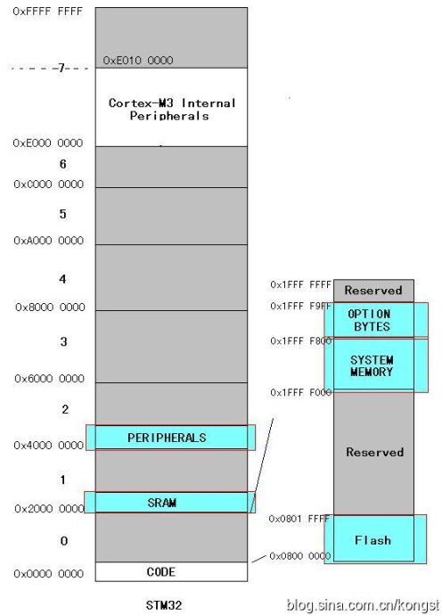 三个组成部分分别在0x0000 0000——0xFFFF FFFF不同的区域,如图(小密度的STM32)所示: