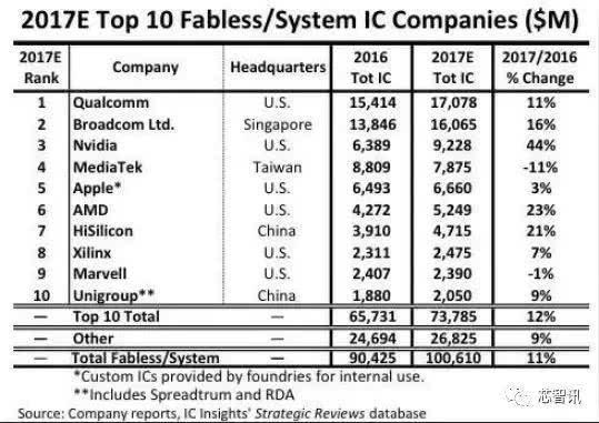多年的潜心研发以及华为的全力支持,使得海思迅速成长为全球第7大芯片设计公司(2017年数据),国内第一大芯片设计公司。ICinsights的数据显示,2017年海思的销售额已达47.15亿美元(约合人民币317亿元)。而TrendForce的公布的最新数据则显示,2018年华为海思销售额已达503亿。这其中,华为的海思麒麟处理器可谓是功不可没(主要得益于华为手机销量的持续增长)。