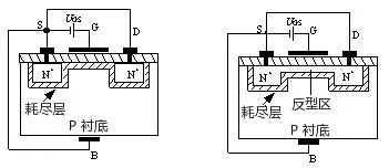 当VGS=0 V时,漏源之间相当两个背靠背的二极管,在D、S之间加上电压不会在D、S间形成电流。