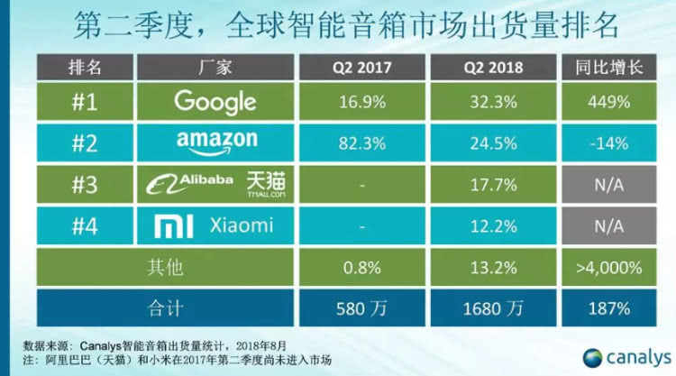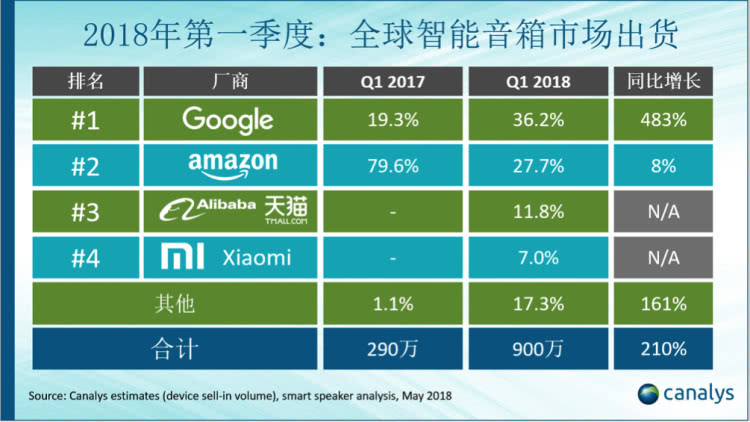 Canalys 发布的 2018 Q1 全球智能音箱报告显示,阿里巴巴天猫精灵以 110 万出货量排到全球第三,中国第一。
