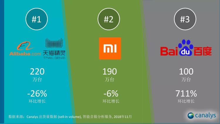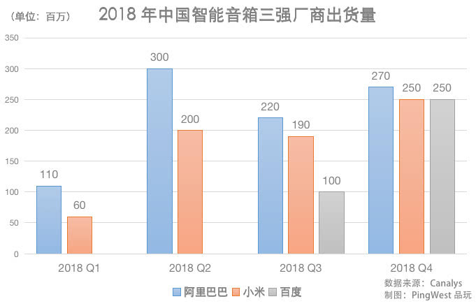 2019 年 2 月 18 日,调研机构 Canalys 发布了中国智能音箱市场 2018 年 Q4 和全年出货量数据。中国智能音箱市场已经形成了稳定的三强格局:2018 年第四季度,阿里巴巴天猫精灵系列出货量约为 270 万台,百度小度系列和小米小爱系列的出货量都在 250 万左右。
