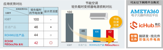 通常,MOSFET具有快速开关以及在低电流范围的传导损耗低的优势。例如,用于空调的情况下,非常有助于稳定运转时实现低功耗。PrestoMOS正是在低电流范围实现低功耗的、以极快的反向恢复时间(trr)为特点的ROHM独创的功率MOSFET。