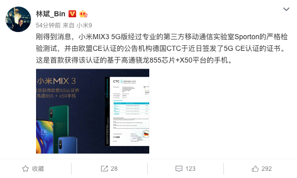 集微网消息(文/ANSON),3月20日小米总裁林斌在微博公布,小米MIX3 5G版经过专业的第三方移动通信实验室Sporton的严格检验测试,并由欧盟CE认证的公告机构德国CTC于近日签发了5G CE认证的证书。这是首款获得该认证的基于高通骁龙855芯片+X50平台的手机。