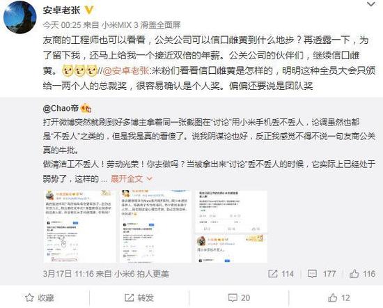 可能是一些网友的言论比较过激,使得@安卓老张——这位小米公司研发总监的高管心情不好,变得冲动起来,今天他又在微博透露了离开华为的细节,他表示: