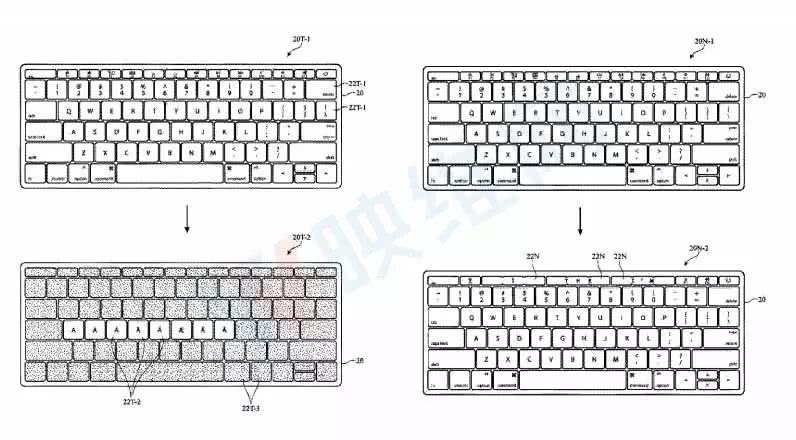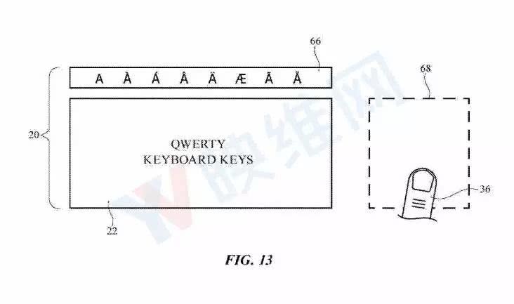 下面的专利图13显示了键盘可以包含触控屏,并呈现一系列的音标字符和其他依赖于情景的选项。