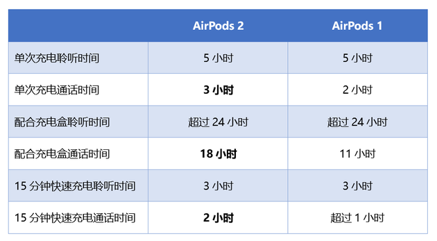 带有无线充电盒的新AirPods和不带无线充电盒的AirPods都延长了电池续航,与第一代AirPods相比,通话时间延长了50%。