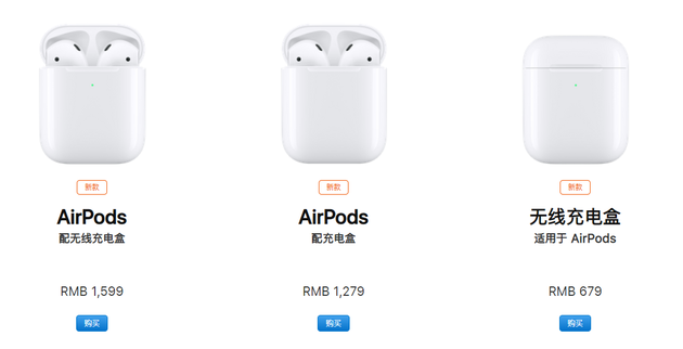 配备标准充电盒的新AirPods售价与第一代相比几乎不变,仅为1279元。配备无线充电盒的AirPods售价1599元。