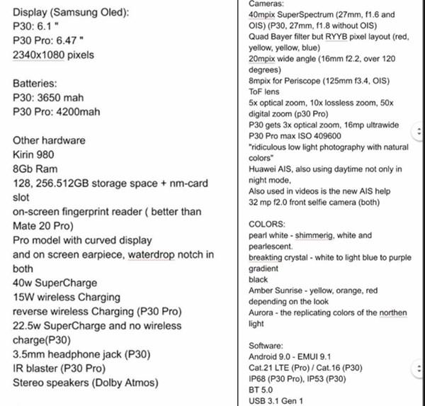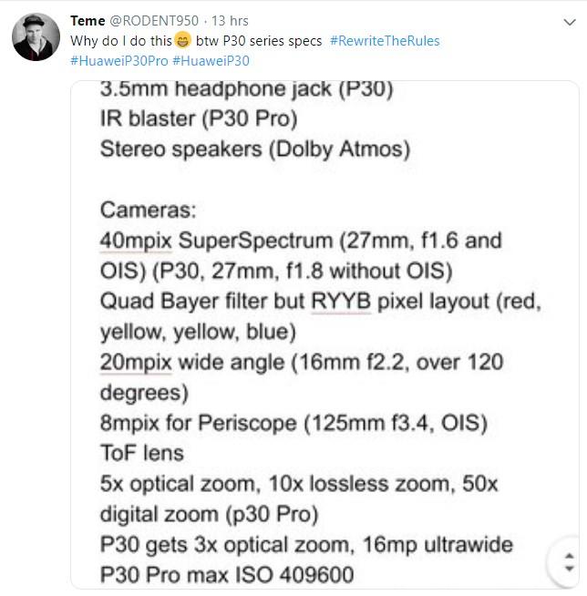 昨日晚间,推特爆料人Teme曝光了华为P30及P30 Pro的具体参数,我们来看一下吧。