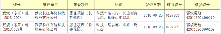 2018年9月,长江存储配套住宅的两块住宅用地获得建设用地许可证,即将开建。建设项目名称为:长存锦园、长存花园。