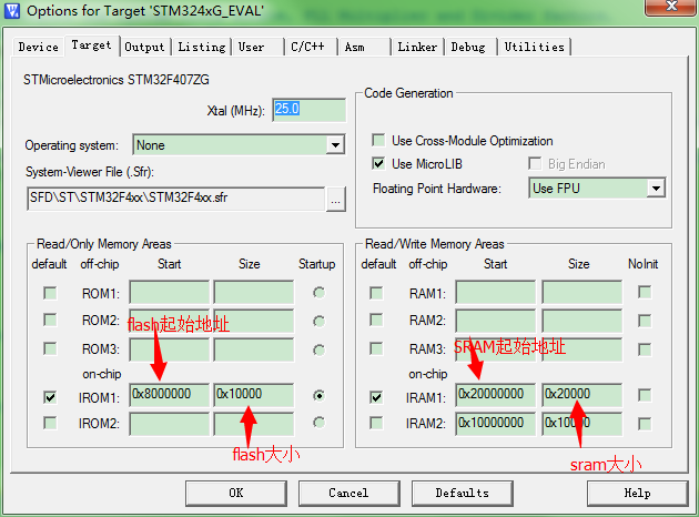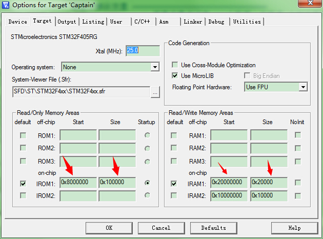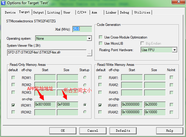 #define FLASH_BASE ((uint32_t)0x08000000) /*! #define SRAM_BASE ((uint32_t)0x20000000) /*!< SRAM baseaddress in the alias region */ 对应keil设置中的(这是一般程序默认的,IAP升级中APP程序的这个地方还得根据中断偏移量改) ② 使用库函数设置偏移量 在库文件中有专门的一个函数 在APP程序初始化时调用函数NVIC_SetVectorTable(NVIC_VectTab_FLASH, 0x10000); 其中/* Vector Table Base----------------------------------*/ #define NVIC_VectTab_RAM ((u32)0x20000000) #define NVIC_VectTab_FLASH ((u32)0x08000000) /*********************************************************************** Function Name : NVIC_SetVectorTable * Description : Sets the vector table location andOffset. * Input : - NVIC_VectTab: specifies if thevector table is in RAM or * FLASH memory. **********************************************************************/ void NVIC_SetVectorTable (u32NVIC_VectTab, u32 Offset) { /* Check the parameters */ assert_param(IS_NVIC_VECTTAB(NVIC_VectTab)); assert_param(IS_NVIC_OFFSET(Offset)); SCB->VTOR = NVIC_VectTab | (Offset & (u32)0x1FFFFF80); } ③修改库文件(不建议使用) 直接修改固件库里面的数值。在void SystemInit(void)下的 /* Configure the Vector Table location add offsetaddress ------------------*/ #ifdefVECT_TAB_SRAM SCB->VTOR = SRAM_BASE | VECT_TAB_OFFSET;/* Internal SRAM */ #else SCB->VTOR = FLASH_BASE | VECT_TAB_OFFSET;/* Internal FLASH */ #endif 直接修改: #define VECT_TAB_OFFSET 0x00 /*!< Vector Table base offset field.This valuemust be a multiple of 0x200. */为 #define VECT_TAB_OFFSET 0x10000 /*!< Vector Table base offsetfield.This valuemust be a multiple of 0x200. */ 2.关于IAP程序与APP程序keil中的设置 Stm32的flash都是从0x8000000开始的,结束地址看片子的flash大小。Stm32的sram都是从0x2000000开始的,结束地址看片子的sram大小。 IAP程序基本默认就行,跟普通程序一样 在APP程序中需要设置一下偏移量 默认的条件下,图中IROM1的起始地址(Start)一般为0X08000000,大小(Size)为0X100000,即从0X08000000开始的1M空间为我们的程序存储(因为我们的STM32F4的FLASH大小是1M)。而图中,我们设置起始地址(Start)为0X08010000,即偏移量为0X10000(64K字节),因而,留给APP用的FLASH空间(Size)只有0X100000-0X10000=0XF0000(960K字节)大小了。设置好Start和Szie,就完成APP程序的起始地址设置。 这里的64K字节,需要大家根据Bootloader程序大小进行选择,比如我们本章的Bootloader程序为22K左右,理论上我们只需要确保APP起始地址在Bootloader之后,并且偏移量为0X200的倍数即可(相关知识,请参考:http://www.openedv.com/posts/list/392.htm)。这里我们选择64K(0X10000)字节,留了一些余量,方便Bootloader以后的升级修改。 注意:设置的起始地址要与程序中设置的中断向量表的偏移量对应起来(如果给IAP程序64k的空间则APPkeil中起始地址为0x8010000相应的程序中中断向量偏移0x10000)我用的1M flash大小的片子。。具体的大小设置,看自己的片子。