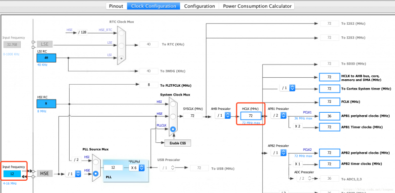 设置RCC和SYS,然后根据板子实际情况设置时钟(麒麟座外部晶振是12M,STM32F103x的最高主频是72M)