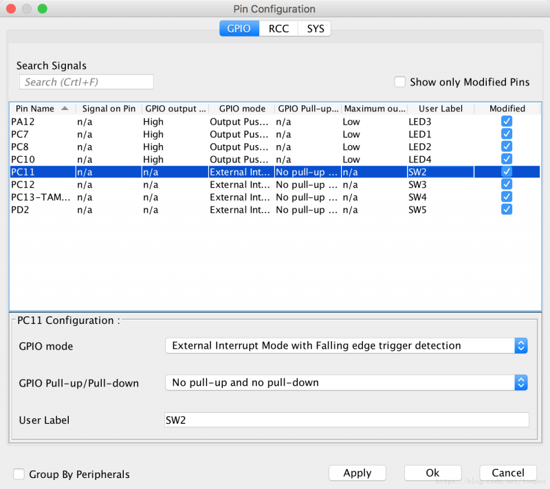 麒麟座按键有外部上拉,所以GPIO_EXIT*不需要配置内部上拉,检测下降沿(Falling Edge),GPIO_EXIT*设置如下