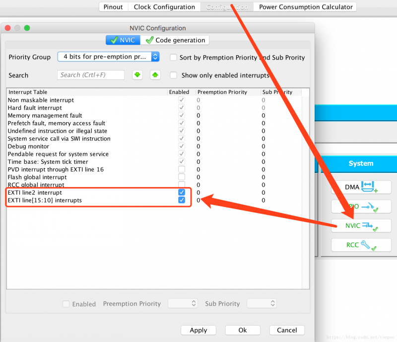 在NVIC(嵌套向量中断控制器)中,勾选EXIT Line2 interrupt 和 EXIT Line[15:12] interrupt 使能中断。右边两个选项设置抢占优先级和响应优先级。此处我们选择默认的,不修改。