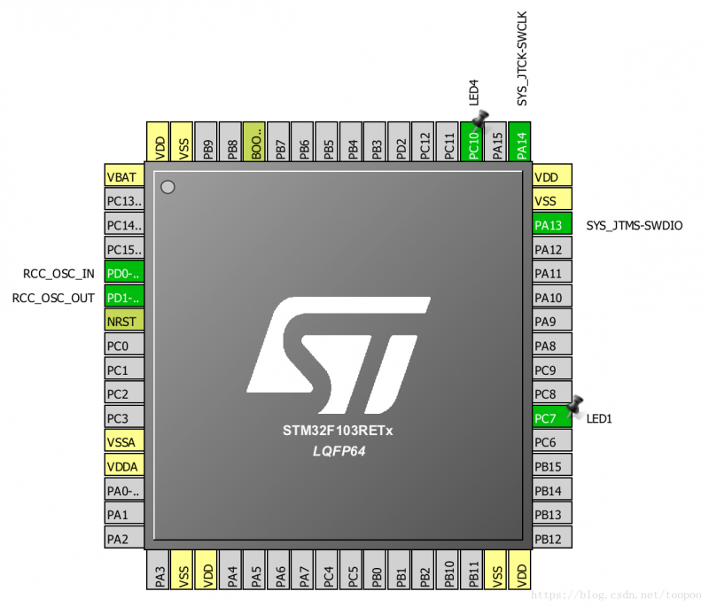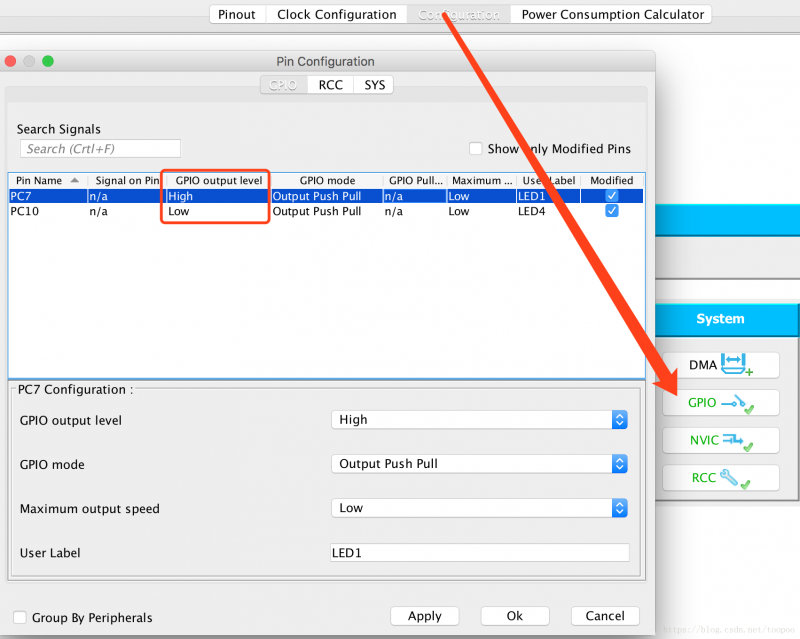 GPIO设置 PC7和 PC10为GPIO_OUTPUT, (这是麒麟座V2.3的四个LED管脚其中的两个)