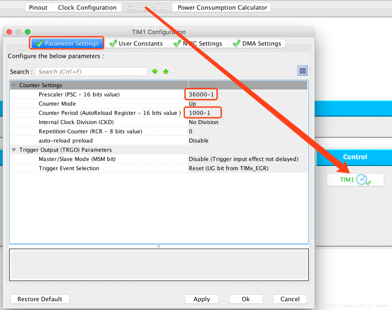 由于TIM1是挂在APB2总线上(如何判断当前计时器在哪个总线,文章最后会描述方法),查看时钟树我们知道APB2当前频率为72MHz,我们希望每秒钟发生2次中断,就把预分频系数设置为36000-1,自动重载值为1000-1,得到的计时器更新中断频率即为72,000,000/36000/1000=2Hz。