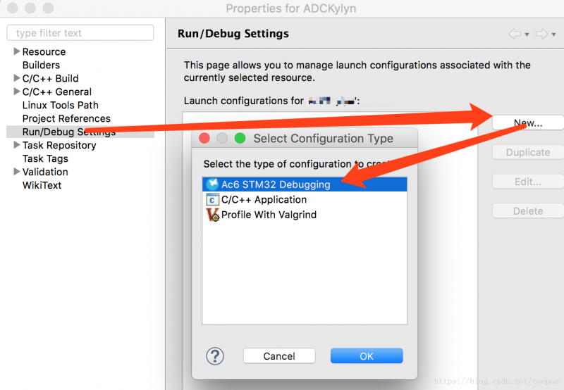 然后右键点击项目,选择Properties, Run-Debug Settings, 点击右侧的New,在弹出对话框中选择Ac6 STM32 Debugging。