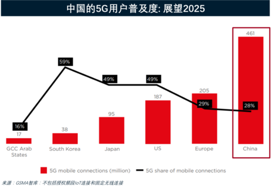 5G是报告中重点强调的经济发展重要推手。中国有望成为全球领先的5G市场之一,预计到2025年底拥有4.6亿5G连接,占总连接数的28%。GSMA会长葛瑞德(Mats Granryd)表示:“GSMA最新报告概述了中国的移动产业已成为经济增长、融合和现代化的主要引擎,并创造了新一代数字消费群体,改变着工业和社会格局的发展。过去十年,中国的移动运营商斥资数千亿在全国各地部署4G网络,现计划在未来两年再投入4010亿元(580亿美元),推动5G网络与业务发展,为中国成为全球领先的5G市场之一奠定基础。”