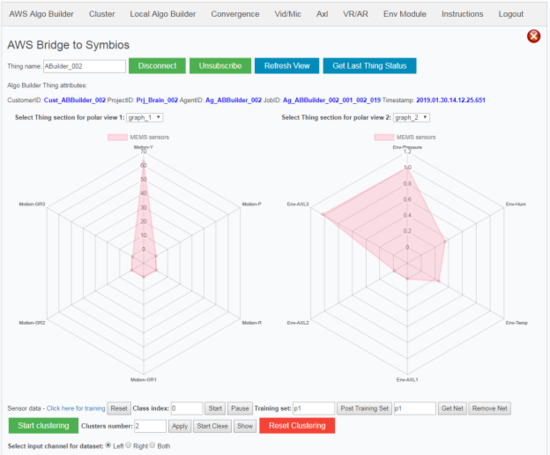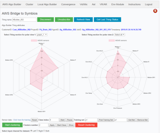 下一张图片描述了另一个Symbios应用场景,通过AWS检索AlgoBuilder的环境和运动参数,并在极坐标图上形成签名。在实际应用中通过移动电路板或更改环境参数,开发人员可以了解签名或模式是如何变化的,因为极坐标轴代表了AlgoBuilder提取和发送的参数,用户能够快速了解从云服务获得的传感器数据对应用项目是否有益。