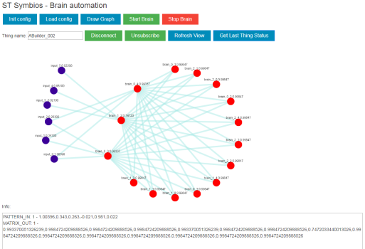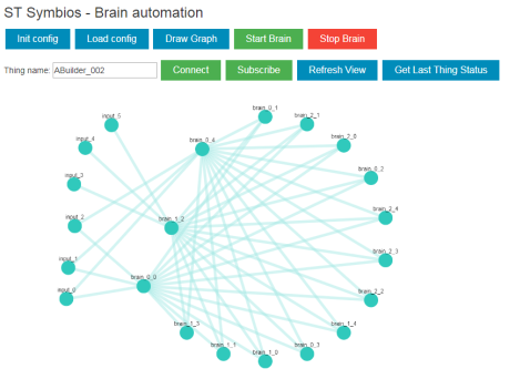 其它的演示示例是在单个应用环境中使用AlgoBuilder融合音视频流,用于开发支持图论和虚拟现实的高级数据融合算法(脑自动化),在我们的RND部门,这个课题目前尚处于研发阶段,我们将在下一篇文章中为感兴趣的读者深入介绍。在本文中,我们简要介绍一下这个令人感兴趣的新方法——如何仅用一个在本地STM32 IoT节点、边缘或云端或者Web应用中运行的单一的分层互联的ANN(称为大脑)来解决复杂任务。下图是一个由多个非同构人工神经网络组成的协同网络的示例,每个图节点表示一个非同构人工神经网络。 大脑正在等待新的AlgoBuilder输入,收到后,输入模式就会被立即传送到所有网络节点。单个ANN被激活,将输出数据传送到其它ANN。通过这种方式,专门执行特定任务的ANN可以协同解决那些需要复杂工具和设备同时从不同角度监测才能处理的更为复杂的任务。