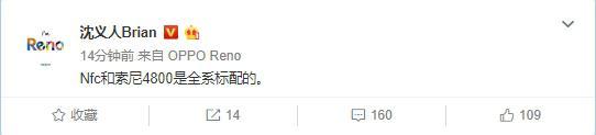 集微网消息(文/ANSON),3月25日,OPPO副总裁沈义人在微博透露了OPPO Reno的一些全新特性,他表示:“NFC和索尼4800万像素是全系标配的。 ”由此可以证实OPPO Reno将会搭载NFC芯片与4800万像素摄像头,也从证实了OPPO Reno将有多个版本。