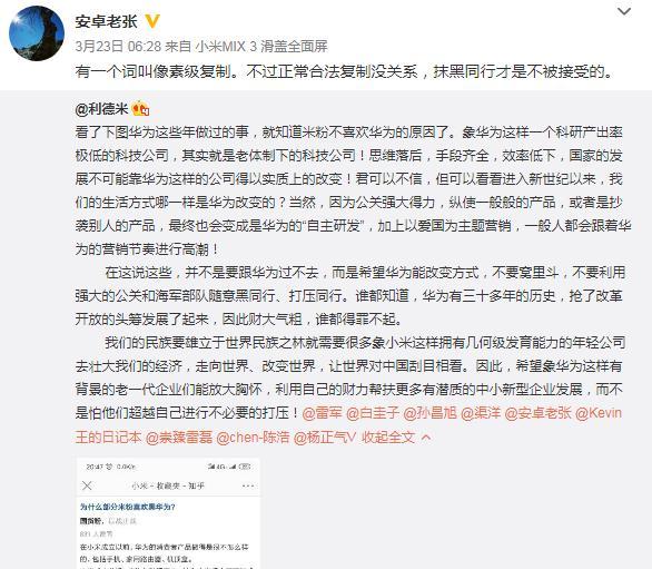 该答案被一位叫做@利得米的网友引用到了微博上,成功吸引了小米公司研发总监@安卓老张的注意,他转发了该微博,猛烈的抨击华为是像素级的复制小米,他称:“有一个词叫像素级复制。不过正常合法复制没关系,抹黑同行才是不被接受的。”