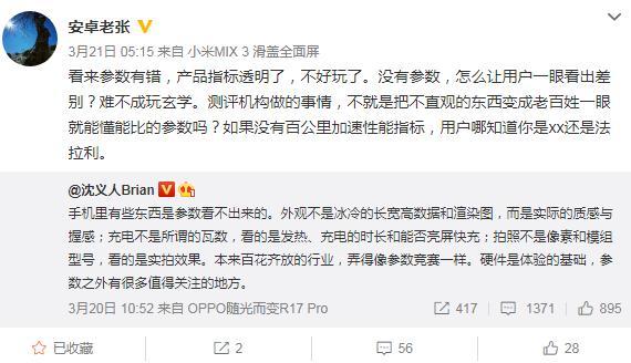 @安卓老张不认同沈义人的观点,将其怼了回去,他表示:“看来参数有错,产品指标透明了,不好玩了。没有参数,怎么让用户一眼看出差别?难不成玩玄学。测评机构做的事情,不就是把不直观的东西变成老百姓一眼就能懂能比的参数吗?如果没有百公里加速性能指标,用户哪知道你是xx还是法拉利。”