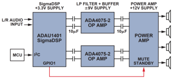 下图是一个4扬声器车载音响系统的框图,其中ADAU1401 SigmaDSP处理器用作音频后处理器。除了采样、转换、音频信号数字处理和生成额外的扬声器通道以外,SigmaDSP处理器还具有通用输入/输出(GPIO)引脚可用于外部控制。微控制器(MCU)通过I2C接口与SigmaDSP处理器进行通信,模拟输出驱动一个采用精密运算放大器ADA4075-2的低通滤波器/缓冲器级。