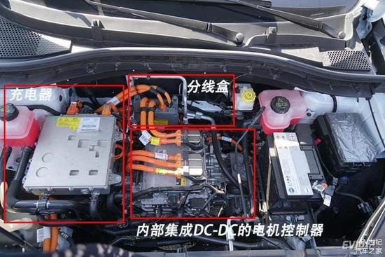 从名爵EZS的前机舱布局我们可以看出,高集成的设计思路使前机舱内各个部件的体积都非常小。最左侧为车载充电机,其输出电线与后方安装在防火墙上的分线器连接,除此之外电池的输出线,电控的输入线均与分线器进行连接。通过分线器的运用,可以有效减少电线数量,提高的传输效率的同时也可以为车辆减重。