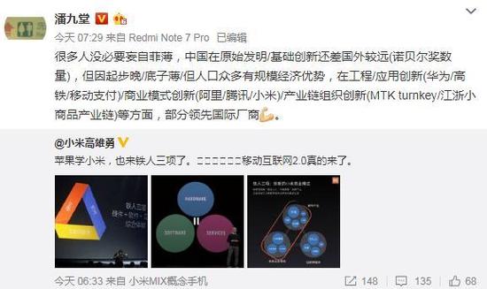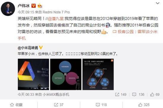 接下来亮相的是小米产业投资部合伙人潘九堂,他表示:我觉得应该是雷总在2012年穿越到2019年看了苹果的发布会,然后穿越回去偷偷改了自己的商业计划书。强烈推荐2011年极客公园对雷总的访谈,看看雷总预见未来的格局和视野。