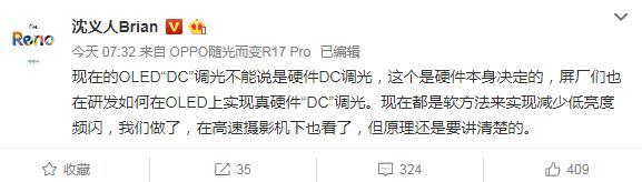 对于上述问题,OPPO副总裁沈义人在微博作了解答,他称:“现在的OLED“DC”调光不能说是硬件DC调光,这个是硬件本身决定的,屏厂们也在研发如何在OLED上实现真硬件“DC”调光。现在都是软方法来实现减少低亮度频闪,我们做了,在高速摄影机下也看了,但原理还是要讲清楚的。”