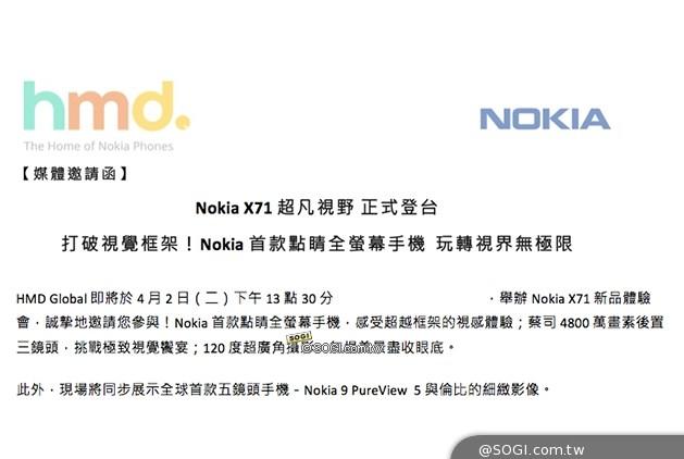 集微网消息(文/叶子),据中国台湾媒体报道,HMD已经向媒体发出了邀请函,诺基亚终于将于4月2日在台湾正式发布诺基亚X71新手机。该公司已经发布了诺基亚X71的新闻稿,并提到了该设备的几个关键功能。X71将搭载“点睛”全面屏,意即该机采用打孔屏设计。另外,该机将搭载4800万像素后置蔡司三摄像头,其中一枚镜头支持120超广角拍摄。
