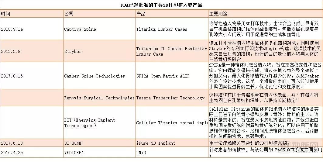 在骨科植入物市场,FDA已经批准了超过35种3D打印植入物。FDA在2018年1月发布了3D打印医疗器械指南草案,征求公众反馈,其中就是主要针对植入物。