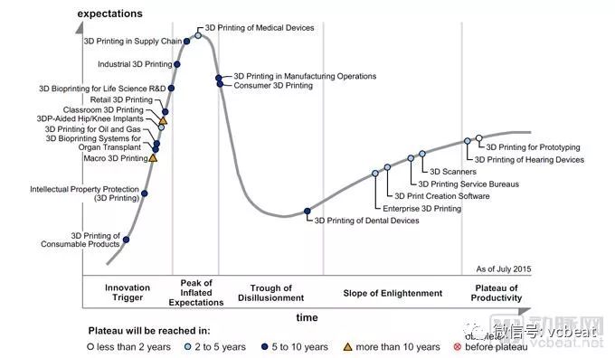 2017年,处于过热期3D打印医疗设备应该在2年-5年期间迎来成熟期;