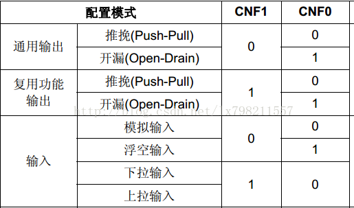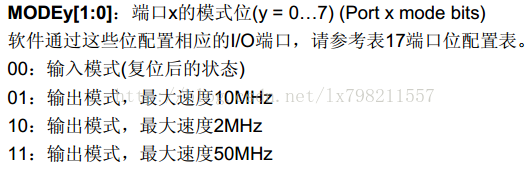 其次配置LED对应的GPIOB和GPIOE端口为推挽输出,即通用推挽输出即00,输出模式速度根据实际情况定义,我这里为50MHz,即11,由于GPIOB_CRL为32位,即20-23位应设置为0011 = 3,其他位不变