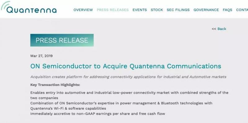 昨日,安森美半导体公司和Quantenna Communications,In联合宣布,他们已就安森美半导体以全场现金交易每股24.50美元、总价10.7亿美元收购Quantenna达成最终协议。据介绍,此次收购显着增强了安森美半导体的连接产品组合,增加了Quantenna的业界领先的Wi-Fi技术和软件功能。
