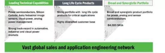 具体的护城河,被Jackson划分为图中这几个区域,首先是最基础的制造业务,其次是布局全球的销售和应用支持网络,最顶层,分别是技术产品,包括了功率半导体、碳化硅、图像传感器、电源管理等,以及面向长生命周期的高质量产品和广泛的客户基础,最后是广泛的产品线,目前公司约有84000类产品组合。