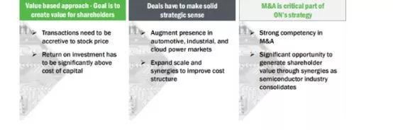 对于安森美来说,并购的最大目标或价值就是为股东们回报,所以投资回报一定要比并购成本大才可以,并购必须要有战略意义,一定要增加公司在汽车、工业及云计算电力供应等领域的领导地位,同时并购可以产生协同效应,包括扩大公司的市占率或者可以有效的缩减成本开销。