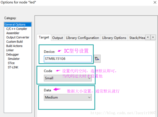8.设置下载工具的类型,STM8可以支持串口下载(比较麻烦!)和ST-LINK下载,我们用ST-LINK下载