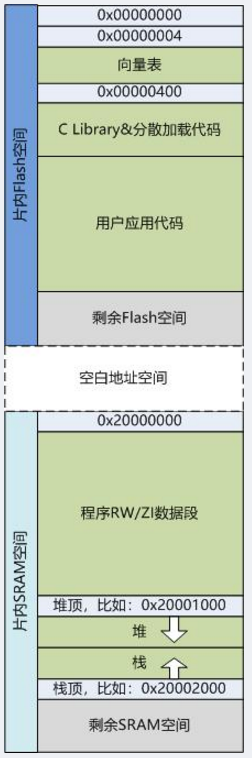 C与汇编是无法解决这个问题的,管程序在存储空间内摆放的是编译器开发环境中的链接器,指导链接器工作的是分散加载的脚本文件,这里需要分散加载的介入。