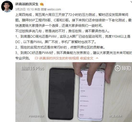 集微网消息(文/数码控),3月25日,魅族工程师洪汉生对外展示了自家手机上DC调光的对比视频,并指出目前在OLED屏幕上DC调光的方式不是通过硬件实现的,存在缺陷,具体使用体验需要消费者自行判断。