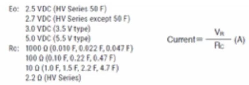 除了部份生产商直接提供参数值外,“漏电流值”可通过向超级电容器施加电压直至特定时间后测量电阻器两端的电压,再根据以下简单方程计算便能得出。