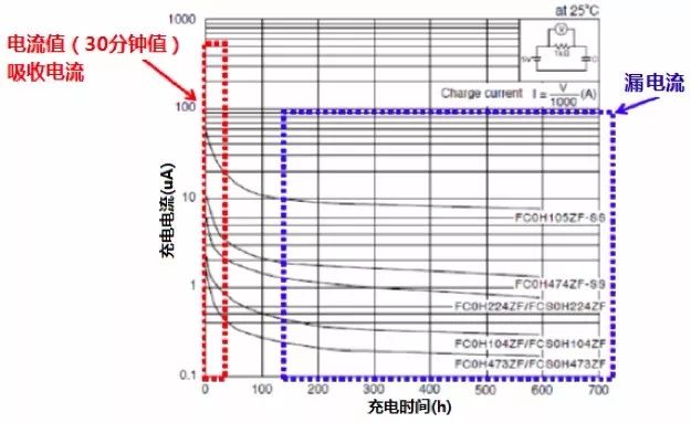 图1中显示了KEMET公司“FC系列”产品在室温下的漏电流特性和测量电路。当超级电容器充电时,存在稳定的寄生电流(Parasitic Current)。超级电容器通过离子“吸收”和“释放”造成充电,并且当离子试图到达活性炭的细孔内部时,充电开始时的寄生电流很高。该初始电流称为“吸收电流”。该充电电流随着时间的推移而减小,并且随着时间的推移变得稳定。在开始施加电压30分钟后的主电流分量是吸收电流。当吸收电流减小时,漏电流成为主要成分。