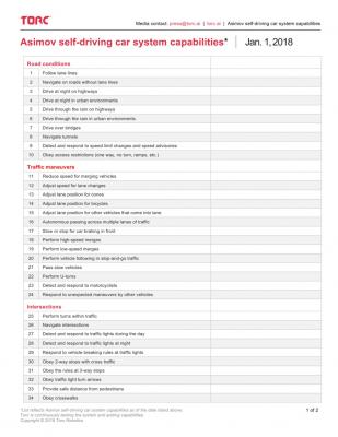 根据国家公路交通安全管理局(NHTSA)为自动驾驶系统推荐的行为能力,Asimov也在制定并更新自动驾驶的功能表单,从交通、系统、道路状况等多个角度分享了自动驾驶系统所必备的能力。