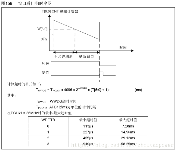 如图所示,在我们设置的窗口 W[6:0] 之前,若是进行了喂狗,则产生复位,或者到达了 0x3F,也产生复位。只有在“刷新窗口”那个区域进行喂狗,才能够继续运行。